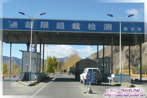 是呀!沒有柏油路,根本就不需要設什麼超速檢查站,或裝什麼測速照相機之類的。現在我們車子前面的這個「曲水霍達超限超載檢測站」,長得像收費站一樣,肯定是所謂文明的產物、進步的指標啦!