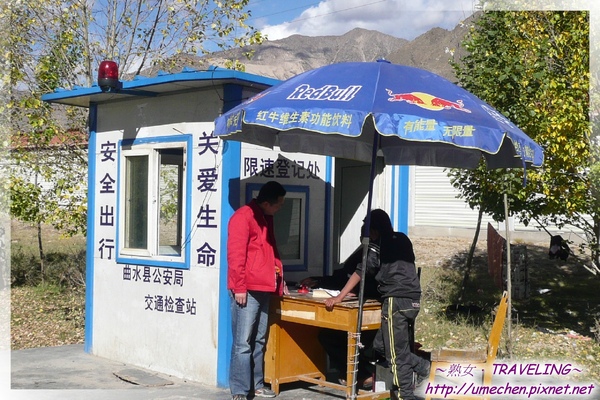 黑師傅要我們坐在車上,不要下車。只見小陳下車後,走到路旁的一個像售票口的小小亭子,亭子寫著「曲水縣公安局交通檢查站:限速登記處」。亭子口簡單擺設了一張木桌、兩把木椅,還在木桌綁了一支500萬保險的大遮陽傘防曬。只見一位工作人員拿著表單在那桌上抄抄寫寫,小陳除了嘰嘰咕咕說了幾句,都靜靜地看著工作人員在堅持不超速的原則下,非常 "龜速" 地抄寫。