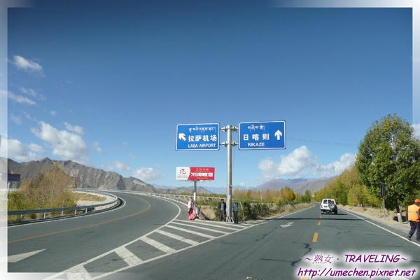 過「超速超載檢測站」一會兒,會與前二天由機場過嘎拉山隧道的跨江大橋相會,很清楚地看到路標指示的叉路,往「曲水」和「日喀則」繼續前行,要去「貢嘎機場」的請向右哦!