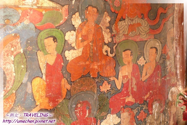 十萬佛塔每層都有很多大小不一的房間,每間裏面都有滿滿的壁畫,看到後來連東西南北都搞不清楚。所以建議一進佛塔,不妨記得是走到第幾層,第二層以上都有一圈陽台,前面有說第一至五層是很多角的,所以陽台曲曲折折如之字型的是一至五層;第六層是圓的一圈;第七層是方形一圈,有大眼睛,先這樣記得啦!