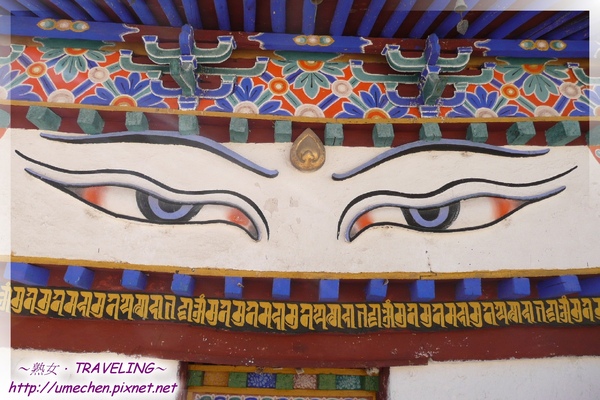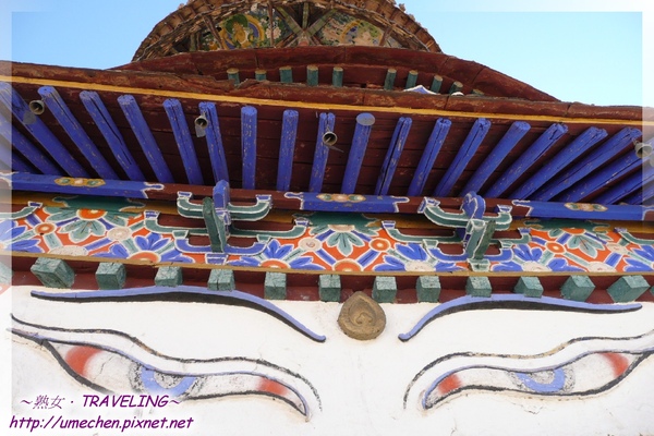 到了第7層,面積已經很小了,要看什麼呢?大眼睛就在這層哦!白居寺除了同時擁有花教薩迦派、紅教寧瑪派和黃教格魯派的佛殿、學院(藏語:札倉),也同時融合了藏族、漢族及尼泊爾的佛寺風格。漢、藏風格應可在建築及塔寺的藝術中找到踪跡,那尼泊爾風格呢?在十萬佛塔有兩處非常明顯特徵,相信很容易就能發現。一是,由第一層開始就可看到,有的塑像最上面有一隻好像咬著蛇、戴著皇冠的藍色大鵬鳥,另一個則是還沒登佛塔時,就被它勾魂的大眼。