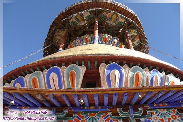 登高莫忘望遠,在第7層請好好地由各方向俯視江孜平原及白居寺全景,當然也莫忘了辛苦一下仰個頭,由金黃色的銅皮所包覆的一圈圈的法輪,構成第8、9層的傘椎狀外形,在青藏高原的陽光下,著實亮眼;若你眼尖、視力好,斗拱、木簷下的雕飾和壁畫,也不妨好好欣賞一番。