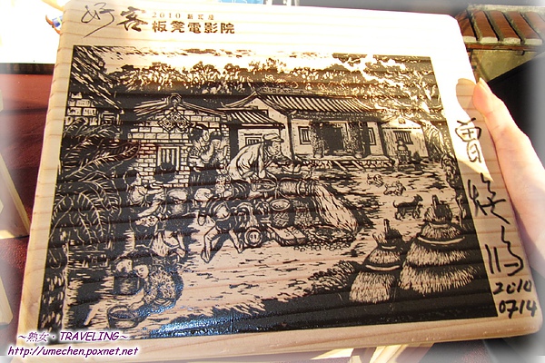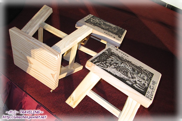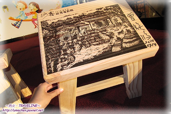 每場電影結束後,可以集章,集滿四個章,在8月7日當天抽方型小板凳。對!小板凳就是抽獎的獎品,但不是普通的板凳哦!〝好客紀念小板凳〞上面有印上板畫作品,將陳永欽先生的版畫作品「兒時的爆米花」拓印在木板上,請看照片,是不是很想帶回去呢?好喜歡哦!