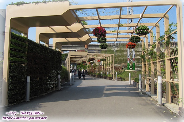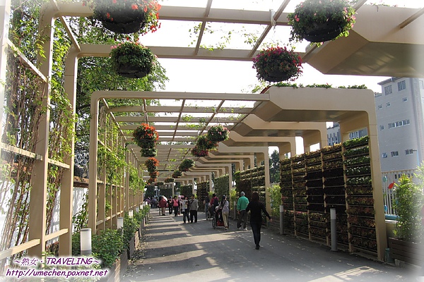 連接〝新生公園區〞和〝大佳河濱公園區〞的隧道,有著好聽的名字「花之隧道:緣築曉徑」,以支架撐出規矩的ㄇ字型,架頂垂掛開滿小花朵的球形盆栽。旁邊的立架面,一邊種植攀爬性的植物,在花博剛開展的初期尚未枝葉繁茂,但想必過一陣子後應會形成一條蔭涼舒暢的〝緣築曉徑〞;另一邊立架面則放置小型盆栽,是一片片的花牆,同樣地當葉兒再長大些,這條花之隧道會更具特色。