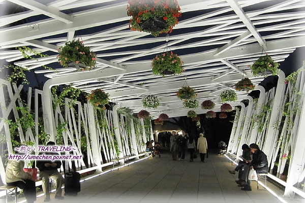 當人們走在隧道下,不必費心抬頭即能望見一球一球的花卉盆栽吊在頂層,色彩鮮豔的花球裝點出柔和又熱鬧的氣氛;而隧道兩旁也種滿了多樣的花卉植物,兼有庭園造景的用心。每到用餐時間,這裏總是聚集了許多遊客,能在花朵隧道下享用美食,豈不快意!