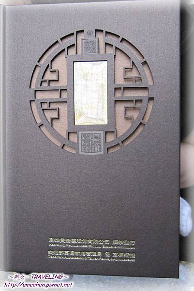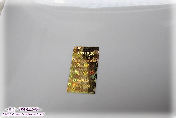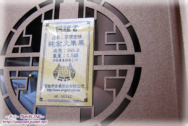 重點是在封面上那片薄薄又閃亮的金片,依介紹是全球首推的一種技術,將大家熟悉的〝永保安康〞火車票,以純金打造,並會產生閃閃幻彩的效果。整套價格8888元,附有保證書與紀念鉛筆組,很多人買哦!熟女沒有考慮買這麼高單價的,人家只是平凡的上班族嘛!呵!
