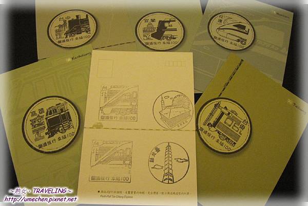 如果不知道〝鐵道旅行.幸福100〞剛推出的6款隱藏版紀念戳章長什麼樣子,或是你的〝鐵道旅行.幸福100〞已經沒地方蓋章了,那不妨買這一套6張明信片。淡淡的色彩,中間圓圓的圖案就是6款隱藏版紀念戳章,熟女小梅子先將台北站的2個幸福100戳章蓋好,完成第一步啦!
