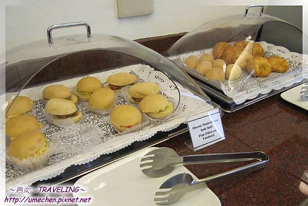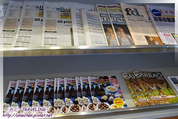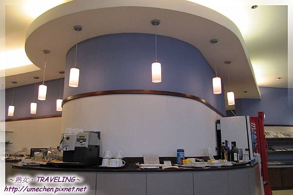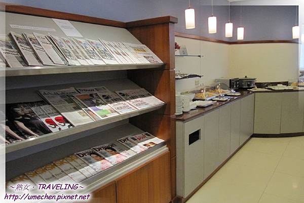 櫃台上和冰櫃裏有各式飲料、酒品、果汁、茶袋、現煮咖啡,熟女煮了一杯咖啡;餐點則有能填飽肚子的小漢堡、麵包、粥、水果,另外餐點櫃的兩旁各有一座雜誌報架。因為早上在飯店吃得很豐富,熟女除了熱咖啡,其他的東西就留在我的記憶卡裏囉!