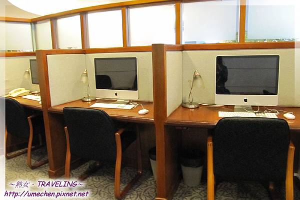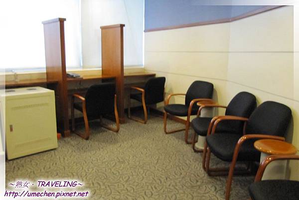 貴賓室裏不到5個人,我們將東西放好後,熟女小梅子開始四處參觀。在服務台後方,是有些類似K書中心一格一格的設計,沒有電腦的人在此能上網兼臨時辦公;其它的坐位區則以休閒與休息為主,有的是方便三五好友一塊兒聊天的設計,而熟女選的位子有小桌能拉至坐位前,這樣我能放上自己的筆電,趁這時間打好一篇文章。