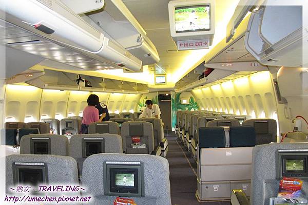 在貴賓室的時間過得很快,我們在登機時間將至時才往登機口走去。又託人力仲介公司老闆的福,我們4個人是全機最優先獲邀進入機艙的,所以熟女才有機會拍到這張其它乘客尚未登機的機艙照片。