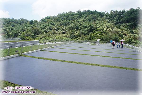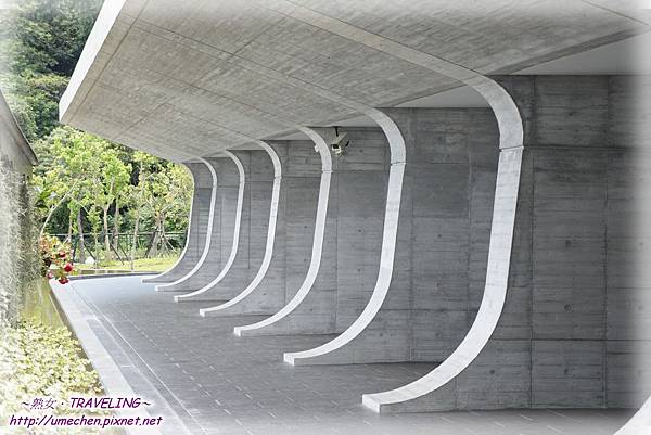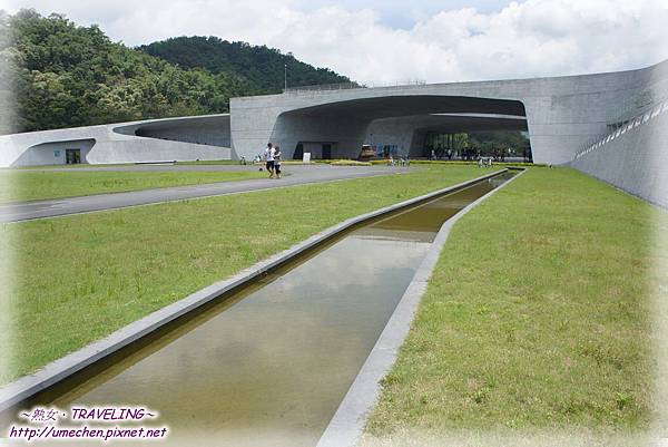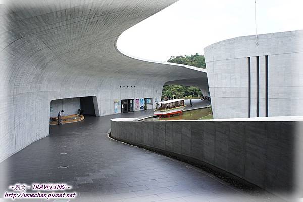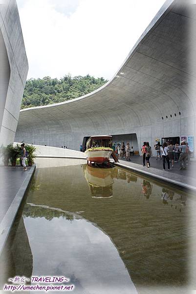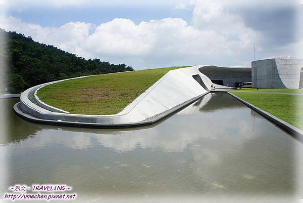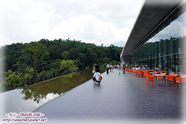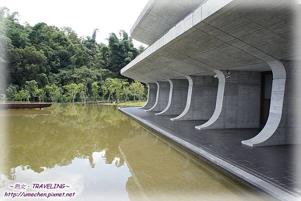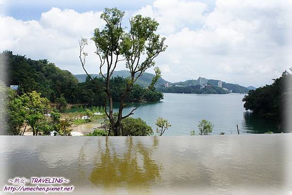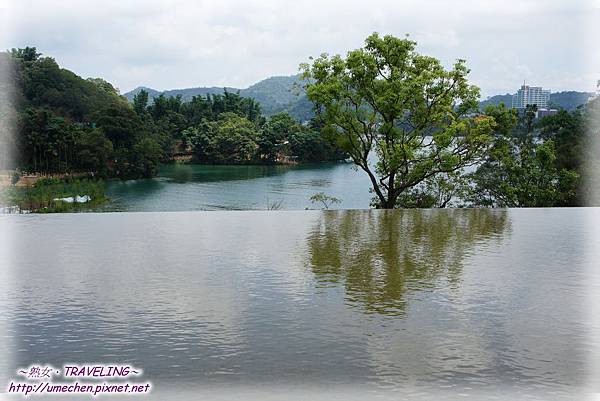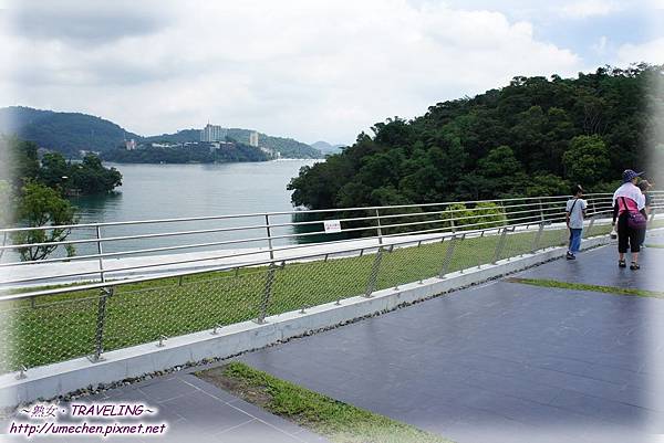 看照片吧!熟女是在接近中午時抵達,說實在話,光線真的不太好,但還是美得不得了。為了讓遊客中心與湖面地熱勢落差,不會造成〝視線斷層〞,在面湖的建築物體前築了水池,池子的水面巧妙地與日月潭的湖水連成一氣,再加上幾株綠樹與湖濱突出的半島,在水面中形成的倒影,加分,再加分!!
