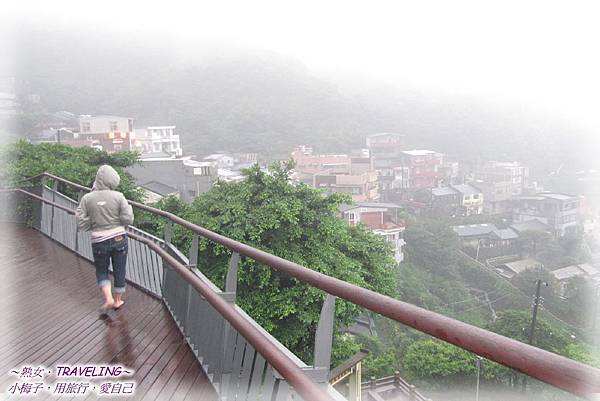 熟女很幸運,在我四處逛的時候都沒有下雨,回到民宿就飄雨,即使山城煙雨濛濛,能見度有限,但也添了詩情畫意。妹妹說,她到九份四次,每次都下雨,這次天氣最好,有時雖然飄些雨,還能不撐傘走來走去。