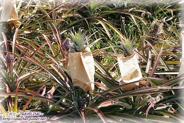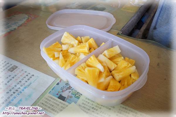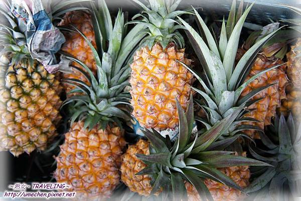 放完炮後,大家來吃正值盛產期的鳳棃。一邊吃當地的〝金鑽鳳棃〞,同時來認識怎麼挑選鳳棃,這可是相當實用的知識哦!原來鳳棃為一年一收成,第一年與第二年長出的果實,因植株本身也年年長大,受重度也不同,所以如果買的是連著果桿的鳳棃,可依果桿的粗細及其植株連接處的彎曲程度,推測為第幾年生的鳳棃;也能依果實表面的果目密度與大小變化去推測;若是行家則通常直接以手指彈打果實,聽聲判定。