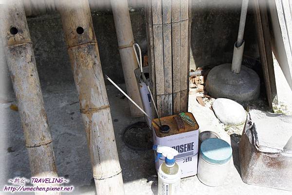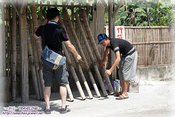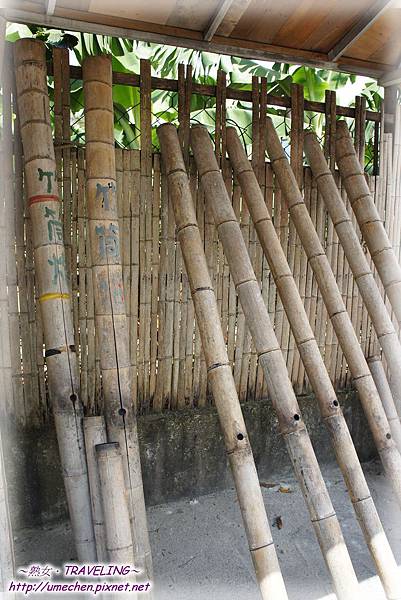 一排長高過人的竹筒排排站,如果排十二隻,理當能達成禮炮十二響。竹筒的中下方挖有一小孔,導覽員示範將數顆電石丟入竹筒的小孔中,再迅速噴入一些煤油,然後點燃點火棒,當點火棒靠近竹筒的洞口,禮炮鳴響,禮成!哈!