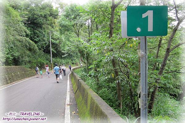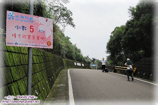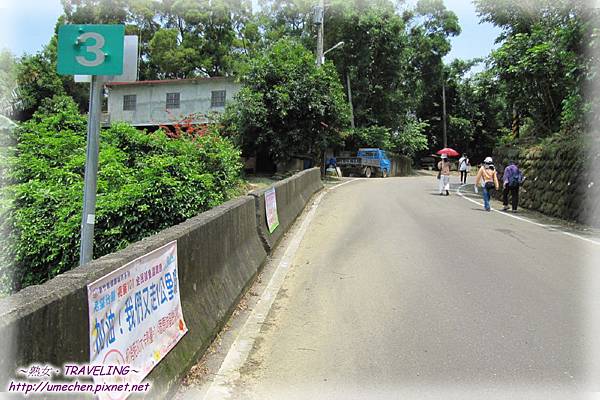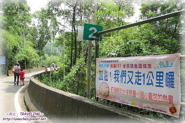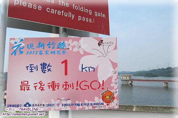 「花舞桐趣.遊客庄」的主會場在水庫下方的「仙爺廟」廣場及附近空地,我們搭乘接駁車在停車場下車後,沿著仙爺路走一段路,經過主會場、上坡路後,在仙爺路、環湖路的交叉路口,即為環湖健行的起點。此路口也是水庫環湖路的0公里起點,所以看路標的哩程數,就知道自己走幾公里了。