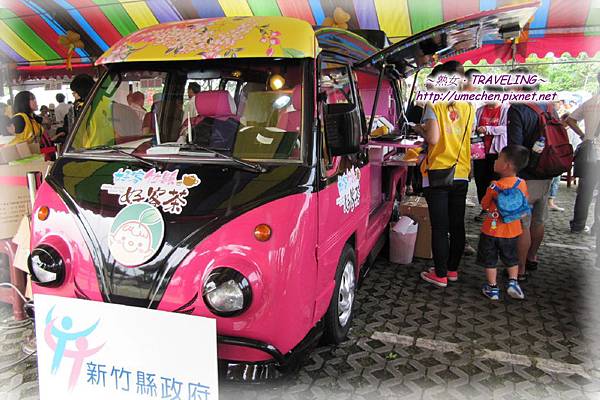 接著經過水庫的管理中心、水壩、壩堤,到了水庫停車場,是另一區活動點。這裏是茶席欣賞與體驗,介紹新竹縣生產的茶葉,搶答得點的朋友,可以現場製作自己專屬的人像馬克杯。另外還有免費的人像攝影,我們家就去拍了4張桐花祭的紀念照片回家哦!