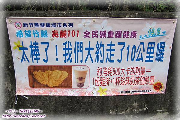 十公里的健行路程對熟女來說駕輕就熟,我真的參加過很多次了,不過已經有幾個月沒有走這種距離,在走的過程中雖不會有疲累的感覺,但倒是活動結束後,搭接駁車回竹北時,開始覺得腳很酸,加上前幾天的工作較忙碌,睡眠不足,我搭車時就睡覺了,回到家連晚餐都不想煮,呵!