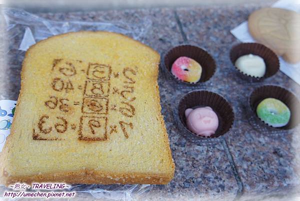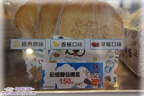 美食區的食物其實不算多,就是吃個紀念而已。最多人討論的是,原味、草莓、香蕉口味的〝記憶麵包〞,一片要50元,真的好貴哦!但還是買了一片。