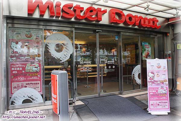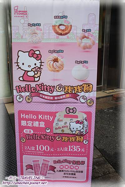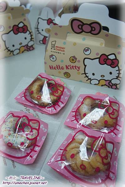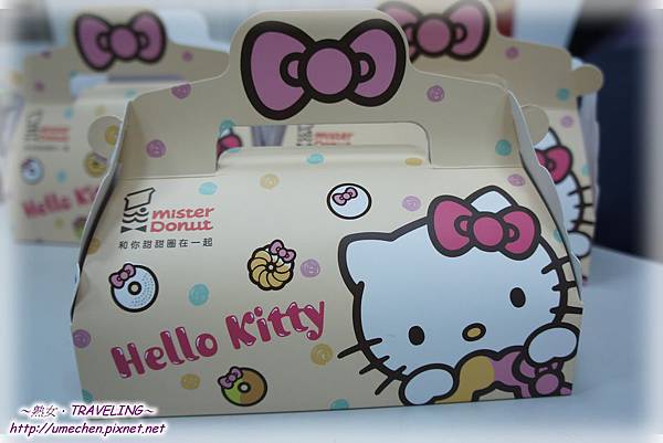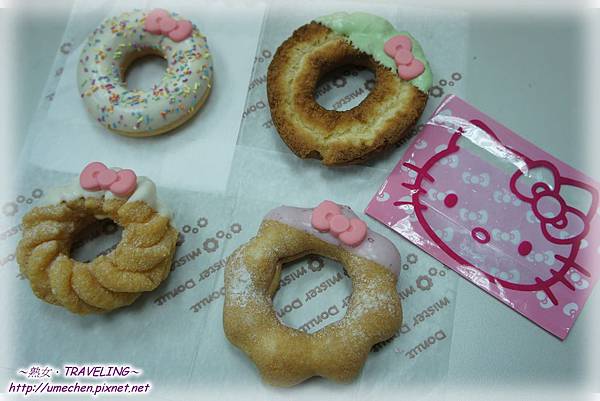 日式甜甜圈「Mister Donut」前陣子在日本推出 Hello Kitty 限定版甜甜圈,Hello Kitty 在廣告中走入甜甜圈店,然後大喊「我找到我的蝴蝶結了!」現在 Hello Kitty 的蝴蝶結也在台灣登場,並於5月22日全台開賣。