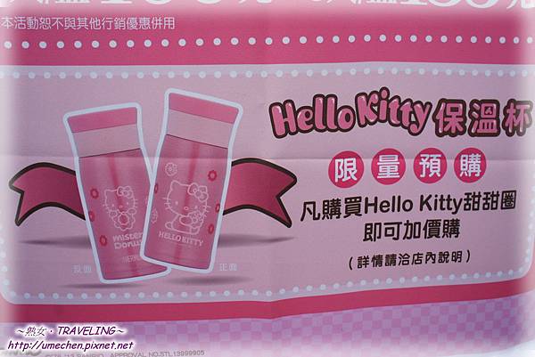 另外,若是購買 Hello Kitty 限定版甜甜圈,可以加價990元買粉色的膳魔師保溫杯,上面印有 Hello Kitty 吃著甜甜圈的可愛圖案,也是限定版的保溫杯哦!預計7月10日開始取貨,熟女也預購了一個。預購保溫杯,同時會送一份集點禮物,所以熟女又多了一個疊疊樂波堤獅玻璃杯哩!(玻璃杯有三款可選)