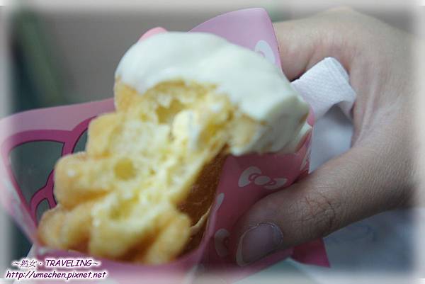 〝法蘭奇〞的口感不似〝波堤、米多拿滋〞Q彈,它吃起來是軟軟鬆鬆的,有著蛋香。裏面夾著黃色的土芒果鮮奶油,表層淋了一些酸甜優格沾醬,一下子就會吃完。土芒果是夏季的限定版哦!