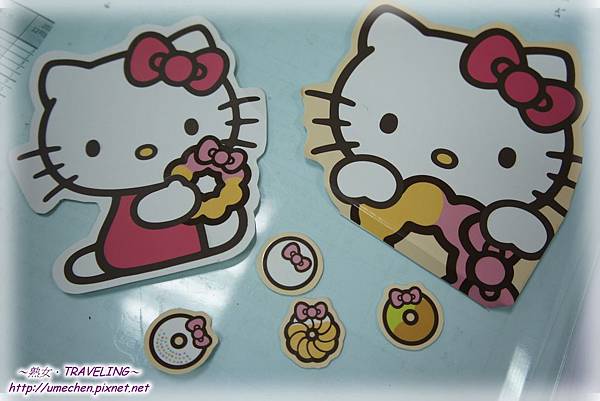 買3個 Hello Kitty 限定版甜甜圈,附送的 Hello Kitty 紙盒,不要丟掉哦!除了拿來裝東西,熟女小梅子將紙盒上的 Hello Kitty、蝴蝶結、小小甜甜圈的圖案剪下來,背面貼一小塊雙面膠。
