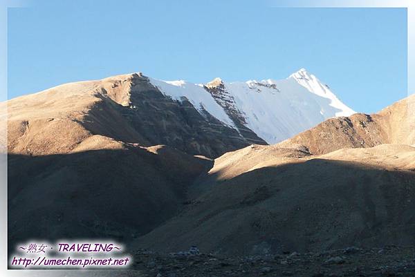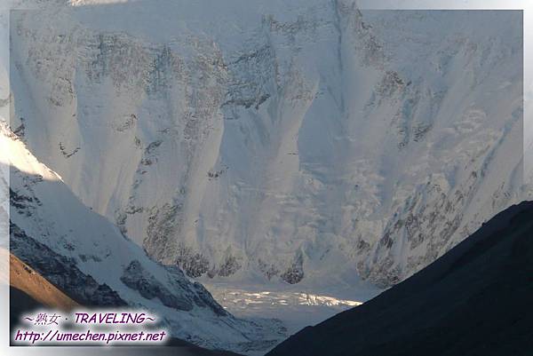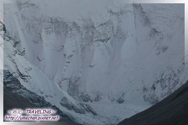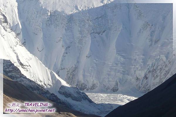 僅就海拔最低、最容易被遮住的「絨布冰川」來說,熟女小梅子有很長的一段時間產生錯覺── 怎麼我這大近視,竟剎時如老鷹銳利雙眼般,能將半小時車程外的絨布冰川看得那麼清楚,連冰川上的層層冰褶幾可細數,真是奇妙呀!