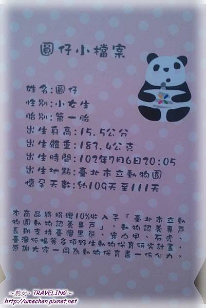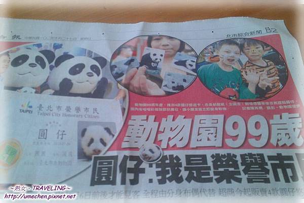 昨天2013年10月26日,台北市立動物園舉辦99周年園慶,市長郝龍斌正式宣佈貓熊圓圓的小寶寶命名為「圓仔」。我之前好擔心票選結果是〝圓仔花〞,如果這樣我真的會昏倒,〝圓仔、圓寶〞名字都很可愛,若取名〝圓仔花〞,我好怕圓仔以後變得三八,哈!還是叫「圓仔」最習慣啦!