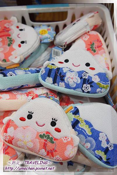 最可愛的是束口袋、錢包這類有點毛絨絨的小物,因為有觸感,顯得特別可愛。另外小吊飾、文具、磁鐵、毛巾、耳挖、湯匙……超多樣式,富士寶寶辨識度很高。