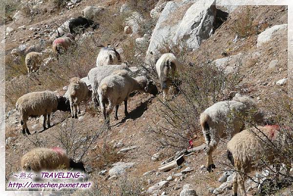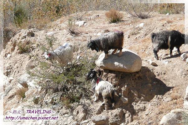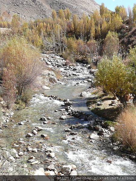 對面有條小河流,斜斜的河坡有群山羊吃草、閒晃,此時秋景正好,我們幾乎都是為了拍秋景照而往小河谷走去。