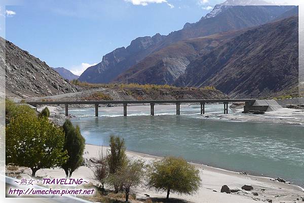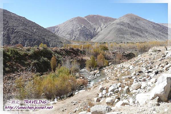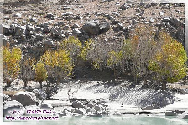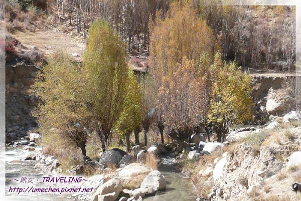 十月下旬,藏北都下雪了,雅魯藏布江谷地即使不見風雪,但夜裏的低溫仍使得部份河水結凍,在陽光正好的此時,微溶的冰體表面益顯晶瑩剔透,真是美極了;加上數株轉黃的白楊木,多數團友鎖定較上游區域拍照,而熟女我卻往下游反向而行。