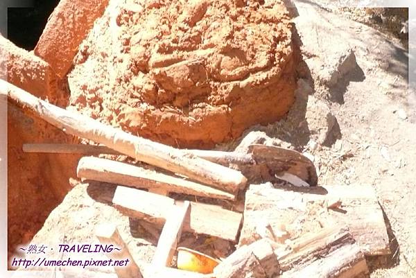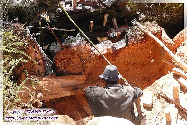 第二道工序,乃在樹幹中間挖一個方形的小凹槽,以安裝一個木楔子。做好的木楔子,在吞巴這處小河谷中,熟女我也看到好幾個散置在老翁身旁;有的可能廢棄了,隨意丟放。