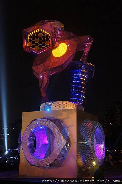 即使岡山燈會規模不大,花燈作品數量也不多,但熟女小梅子覺得有二件作品值得推薦。一是本次岡山燈會主燈〝羊羊得意‧提前(錢)來到(倒)〞,我第一眼看到這個主燈,有看出三個物件:螺絲、羊、蜂蜜,後來看了介紹,原來這件主燈包含了岡山最著名的羊肉、豆瓣醬、蜂蜜、螺絲,非常具有在地特色與精神。