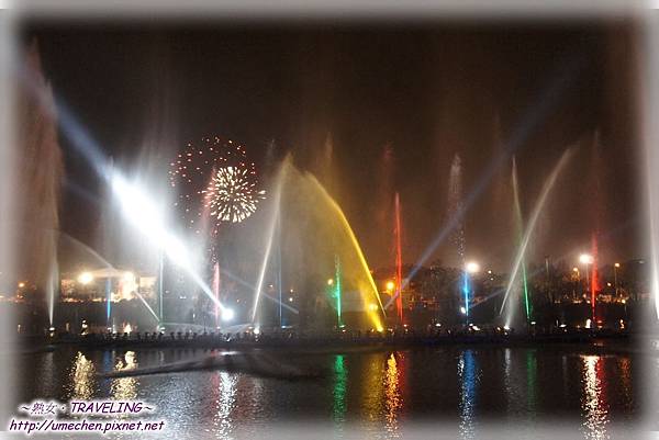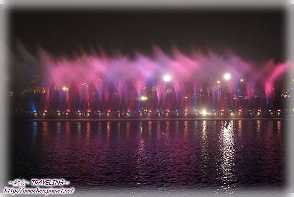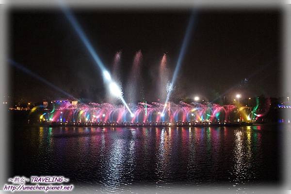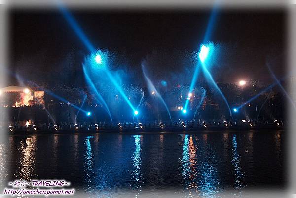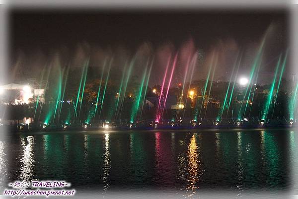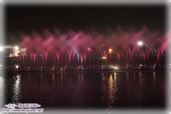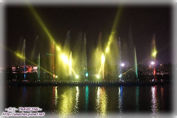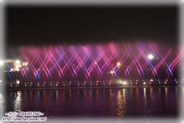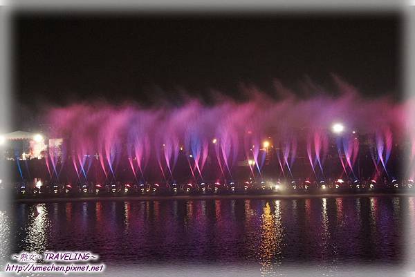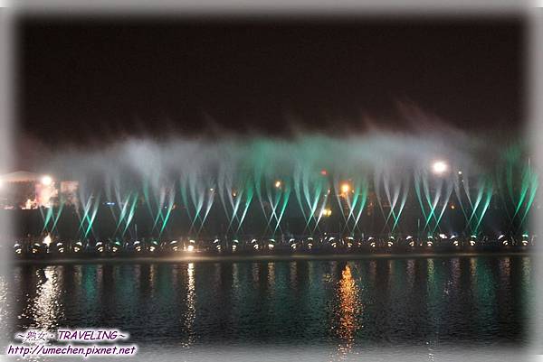 熟女我個人認為,這裏還有另一項優勢:水舞區的背面方向,除了燈會的舞台、少數燈籠、作品、公園路燈,沒有礙眼的房屋建築、燈光干擾,欣賞水舞少了很多的〝雜質〞;而且水池腹地還算夠大,站在觀景台前排的我們,只偶爾會被噴到一點點清涼的水霧,哈!