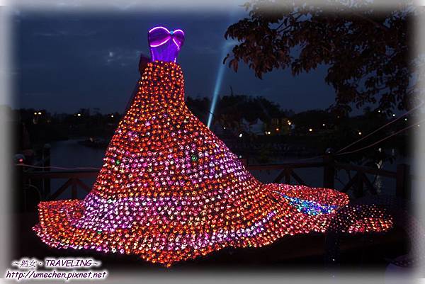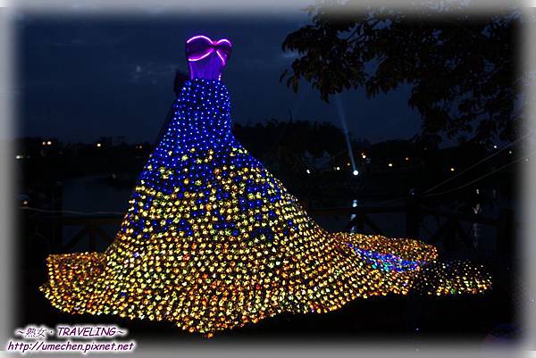 第二作是位在水舞觀景台旁的受刑人作品〝花嫁〞,以廚房常見到的鋁合金管為素材,打造出一件象徵待嫁女兒心的嫁裳,在夜間閃耀著不同光彩,是頗有意涵的作品哦!