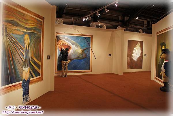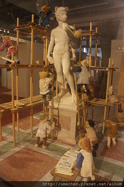 同樣有交待原來的雕塑作品照片、簡介,主角當然不再是人像,而是〝熊樣〞,哈!〝海克力斯像〞和〝維納斯像〞,和原來作品的感覺大大不同,但現場的場景氣氛還有點仿真;米開朗基羅的〝大衛像〞,還模擬如同小人國正在維護或修復塑像的情形,多了點趣味。