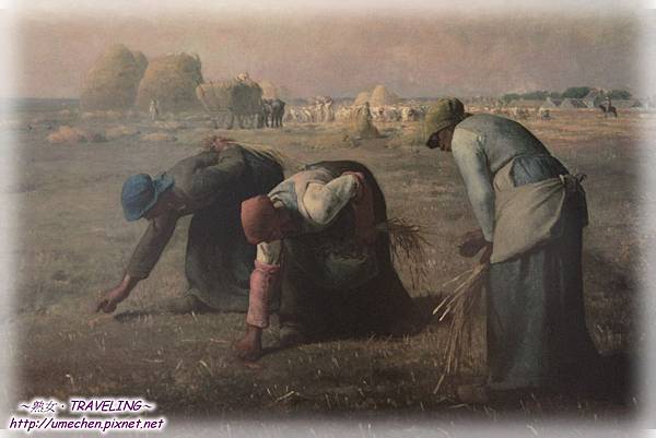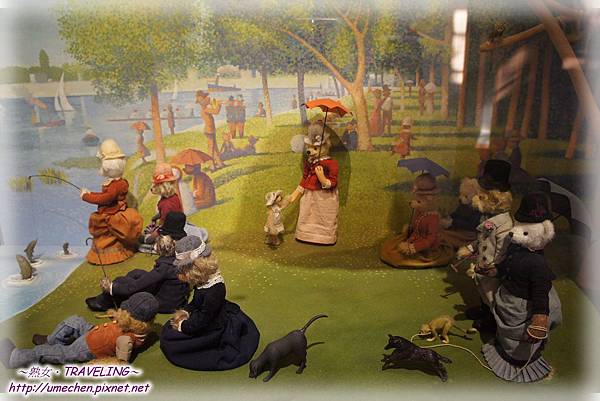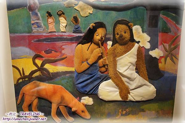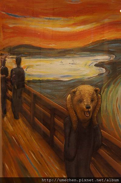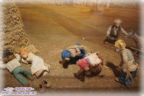重新以泰迪熊為角色,所以畫作不再是平面的,製作了一幅幅世界名畫的立體版,連花草樹木也變得活脫脫地。甚至有幾幅作品還延伸了原畫,例如米勒的〝拾穗〞,除了原畫作三位農民,還多了麥草堆、悠閒隨躺的農民……,讓作品更豐富。