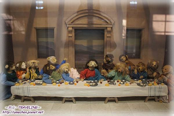最經典的兩幅,應屬達文西的〝最後的晚餐〞與大衛的〝拿破崙越阿爾卑斯山〞,不但耶穌、門人、拿破崙、軍隊全變成立體的泰迪熊,還會動態演出,活靈活現。