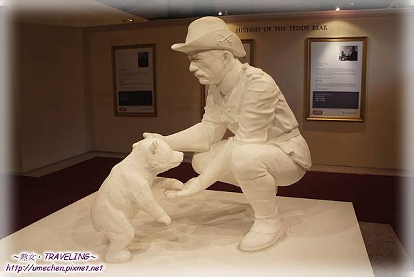 展場中有一座雕像,乍看之下以為是〝忠犬(熊)小八〞,其實是美國總統羅斯福與熊。藉此雕像與牆面說明,讓大家瞭解 TEDDY BEAR 的由來。