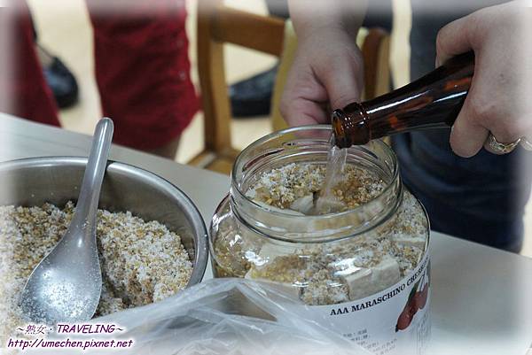 最後加入米酒,淹過鹽豆腐。倒入米酒後,會發現豆粕和糖接觸米酒,往下方沈澱,最上一層的豆粕甚至消失。此時要在上層再添入豆粕,但要注意的是,罐口要預留一些空間,不要填得滿滿的,畢竟豆粕會發酵。