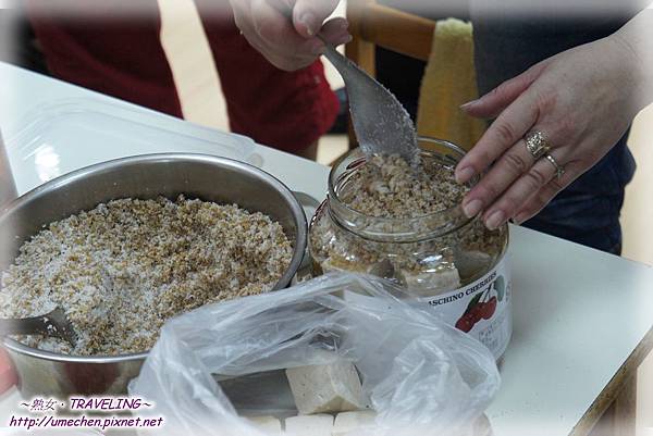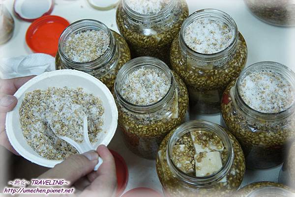 接著裝罐囉!視準備的玻璃罐大小,先舖一層鹽豆腐,像我們準備的罐子,大概一層放4塊。然後一層鹽豆腐,舖一層豆粕和糖的混合,如此一層一層地,直至放不進罐子裏。