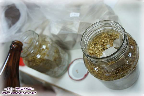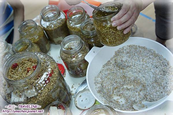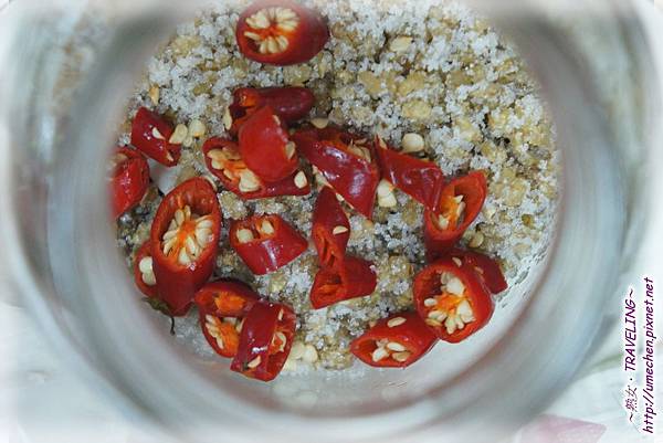 想增加風味,可從中加入數片切好塊的香蕉和鳳梨,或是辣椒。因為我們訂了八十塊鹽豆腐,裝了九罐,其中有幾罐加了一點辣椒。
