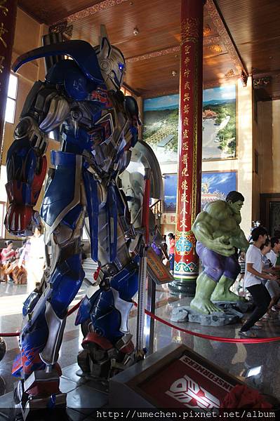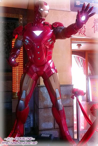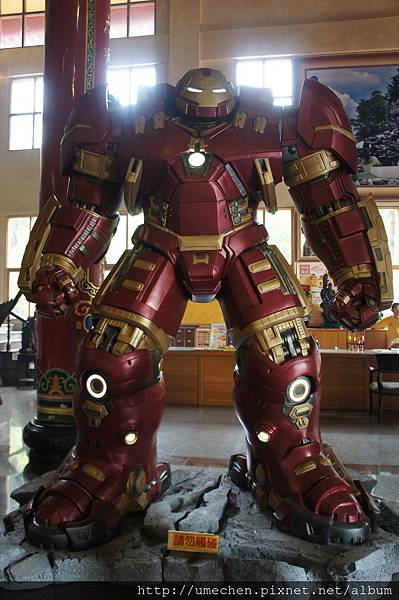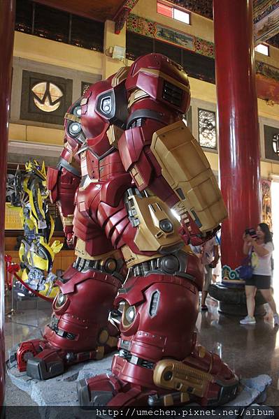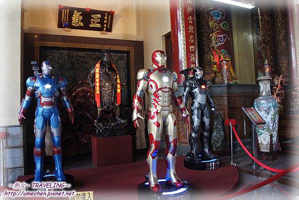 自從2013年獲贈四尊鋼鐵人模型:酒紅色與銀黃相間的鋼鐵人第一代模型,及Mark 42、愛國者、戰爭機器等三尊鋼鐵人。又於2014年陸續進駐二尊變形金鋼:藍銀色的科博文、黃色的大黃鋒,陳列於大殿左右兩側,共同護衛。