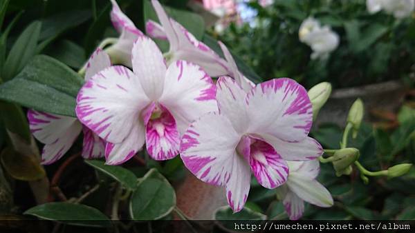 ¤ 彩虹石斛:白色花瓣與花萼中間一抹桃紅線條,是其特色。我猜是線條形成的淺深相間,如同彩虹色彩相間而名。