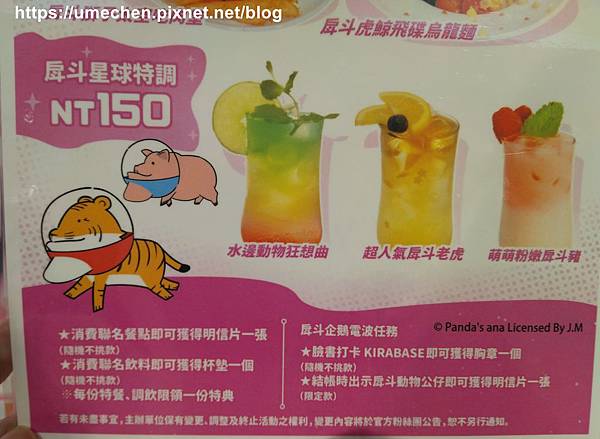 聯名飲料共有3款:〝水邊動物狂想曲、超人氣戽斗老虎、萌萌粉嫰戽斗豬〞。消費任一杯戽斗星球聯名飲料,送戽斗星球太空限定款杯墊一個,不挑款。飲料送上來,也會有一個杯墊墊在玻璃杯下方,所以會得到兩個杯墊哦!