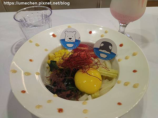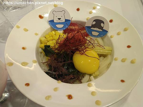 〝戽斗獅子太空吃肉堡〞,是薯條與漢堡的組合餐點,上面會插上戽斗獅子的圖卡;〝戽斗虎鯨飛碟烏龍麵〞,熟女點的即為此餐,為烏龍麵加生蛋黃、配料的餐食,上面會插上搭乘飛碟的虎鯨圖卡,圖卡紙質防水、有些硬度,可帶回家當書籤。我的餐則插上2個圖卡,另一圖案為北極熊哦!