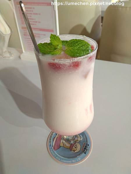 看飲料名稱完全不知道為什麼取這名字,呵!所以點餐時請女僕幫我解釋一下飲料的內容。熟女點的是萌萌粉嫰戽斗豬,為草莓、牛奶、優格調製的飲品,味道喝起來不酸不過甜,就是淡淡的,喝起來印象不深刻,但也不會不好喝啦!