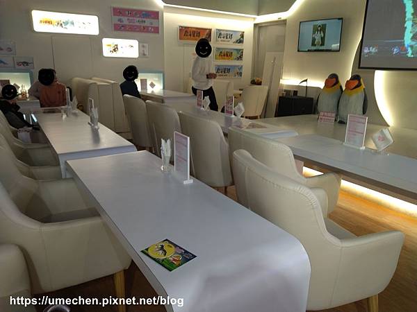 店內原本裝潢以白色為主,桌椅也是白色系列,而且多以面向舞台為方向,這是為了讓主人們欣賞表演與遊戲互動而設計。快閃主題店期間,牆面則有不少戴上太空罩的戽斗動物們的海報;舞台上有兩隻戽斗企鵝;而櫃台前方則有小隻的戽斗小公仔陳列,看看主人們平常是否有蒐集到這些戽斗公仔。