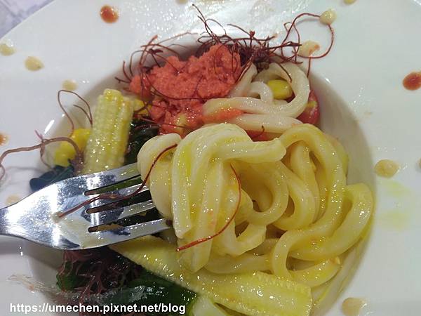 烏龍麵很滑溜,將生蛋黃攪散,本來就是熟女每次去吃火鍋最後都會以生蛋黃+冬粉、麵、年糕做收尾的技法,百吃不厭呀!不過配料有一種紅紅的像魚卵的東西,我不喜歡它的味道,其他配料都不錯哦!