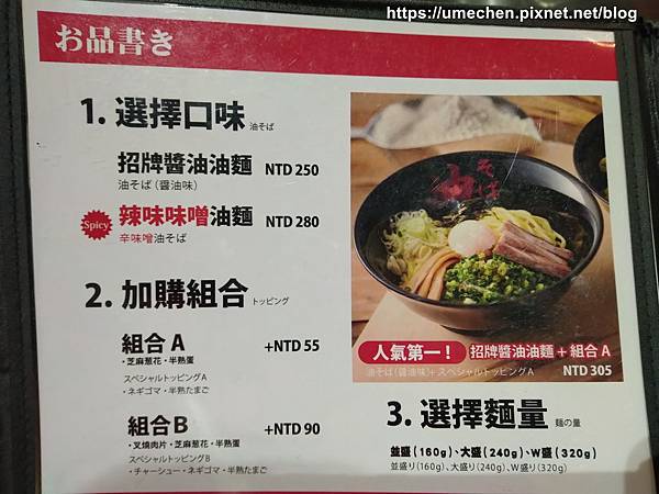 油拌麵是乾拌麵,點餐時先選擇 醬油油麵或是辣味味噌油麵;再來看看是否要加價增選配料,基本配料有海苔、荀絲、肉絲,想擁有更豐富的配料就加價點餐,熟女覺得這樣很不錯呀!